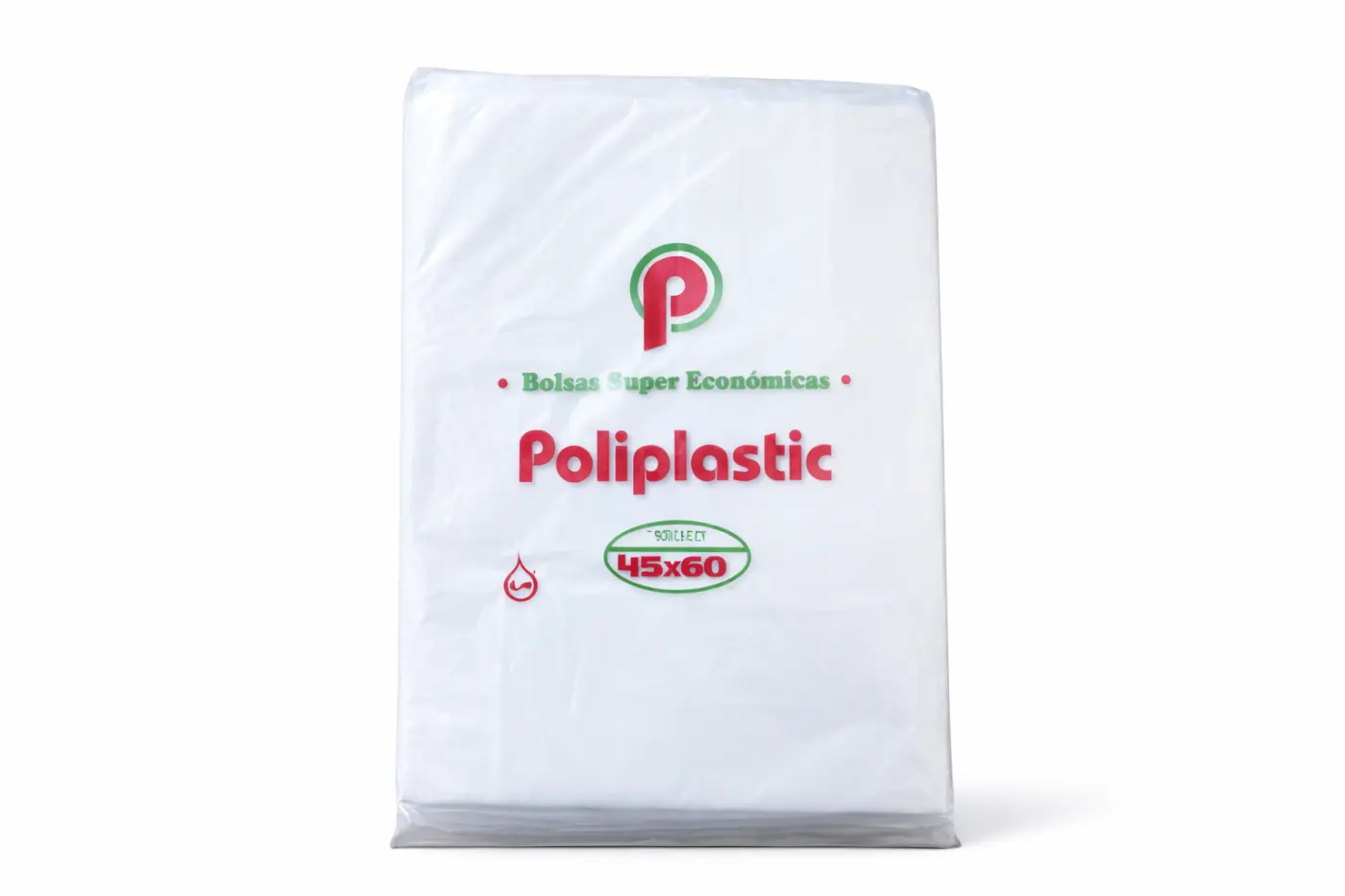 Bolsa plástica resistente con asas, usada para transportar productos. Fabricada en polietileno, es flexible, económica. Disponible en varios tamaños y colores.