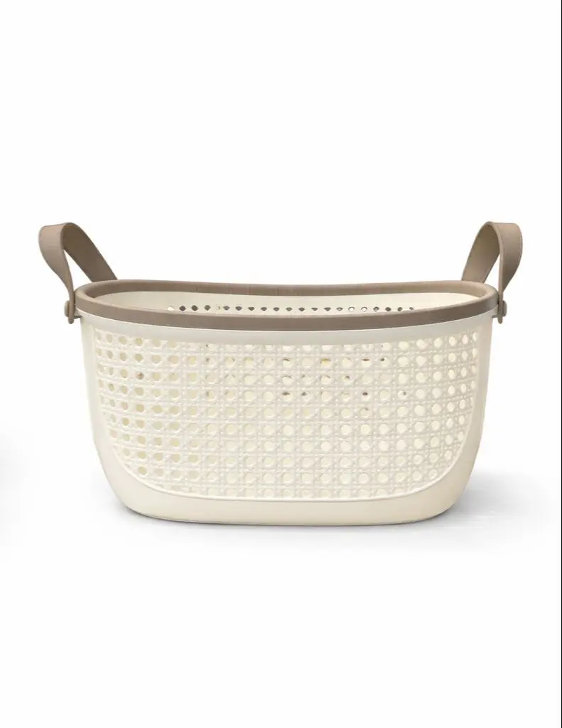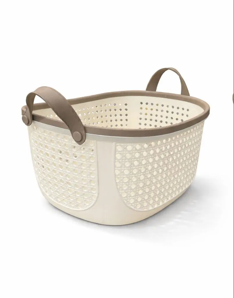 Canasta organizadora multiuso de plástico resistente, con diseño perforado para mayor ventilación y asas ergonómicas para un transporte cómodo. Ideal para organizar ropa, baño, limpieza o almacenamiento general.