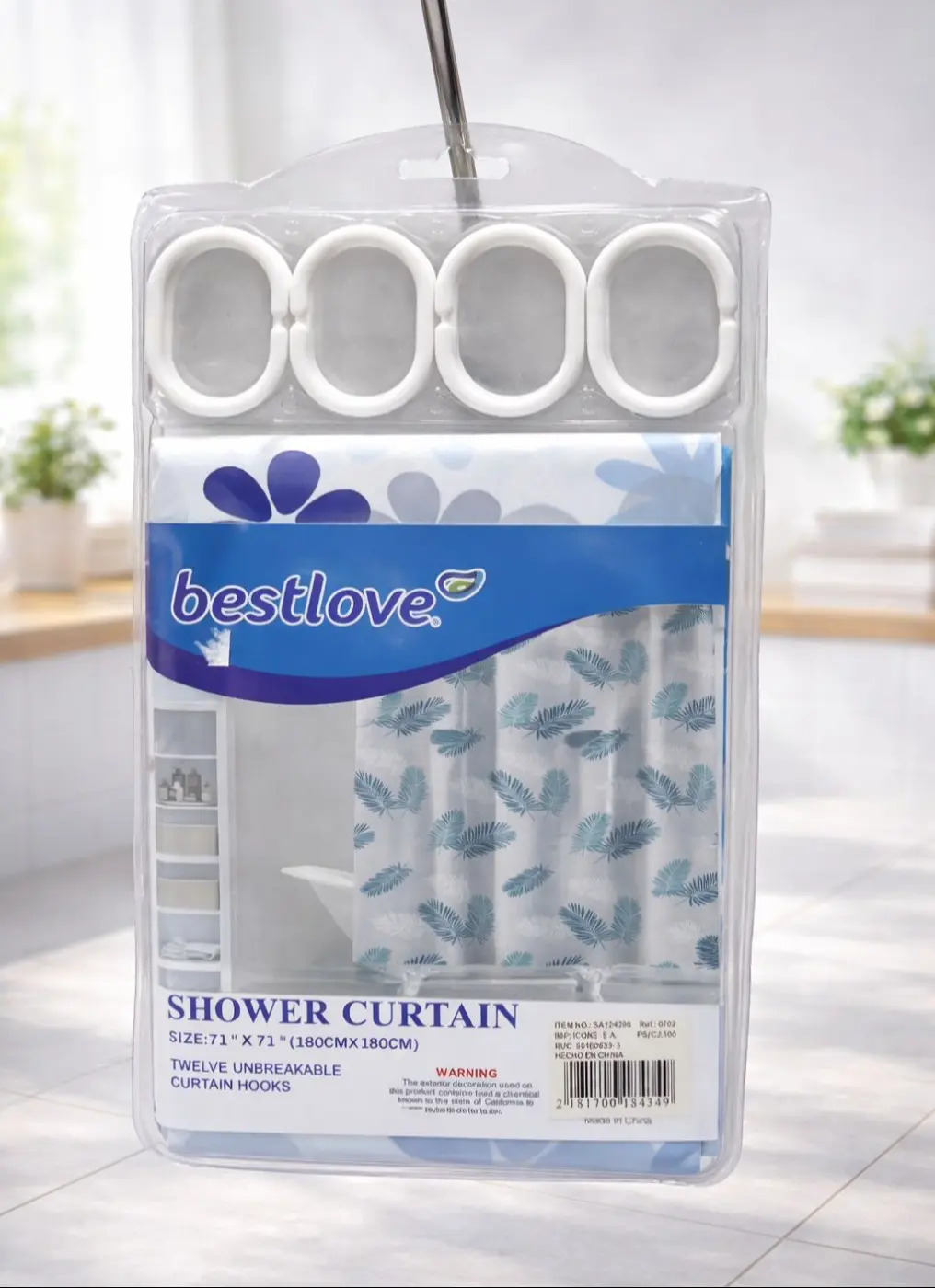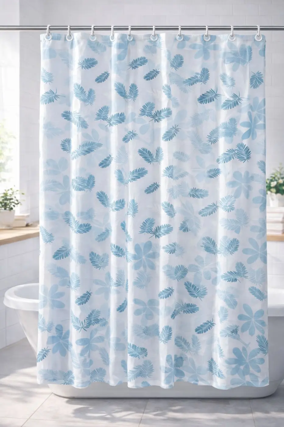 Cortina de baño decorativa con ganchos incluidos. Resistente, practica e ideal para mantener el área de ducha seca y ordenada.