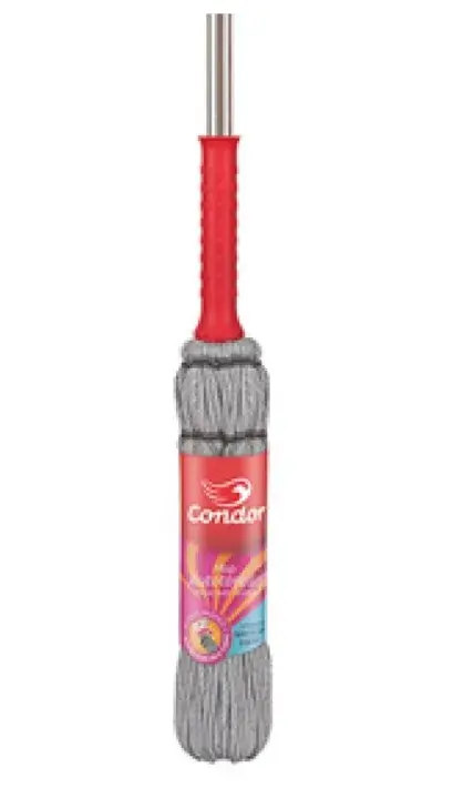 El Esfrega Auto-Torcion Condor (1570) es un mop compacto y práctico con mango retráctil de 1,28 m, ideal para espacios pequeños. Sus hilos de microfibra absorben agua y atrapan polvo, permitiendo una limpieza sin contacto directo gracias a su sistema de torsión incorporado con goma de seguridad.