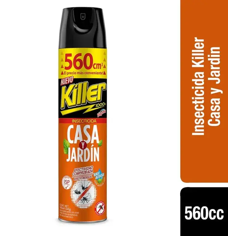 l insecticida Killer Casa y Jardín en aerosol de 560cc es un producto de base agua diseñado para eliminar insectos voladores y rastreros (mosquitos, moscas, cucarachas, hormigas, arañas, ciempiés) con efecto inmediato y residual.