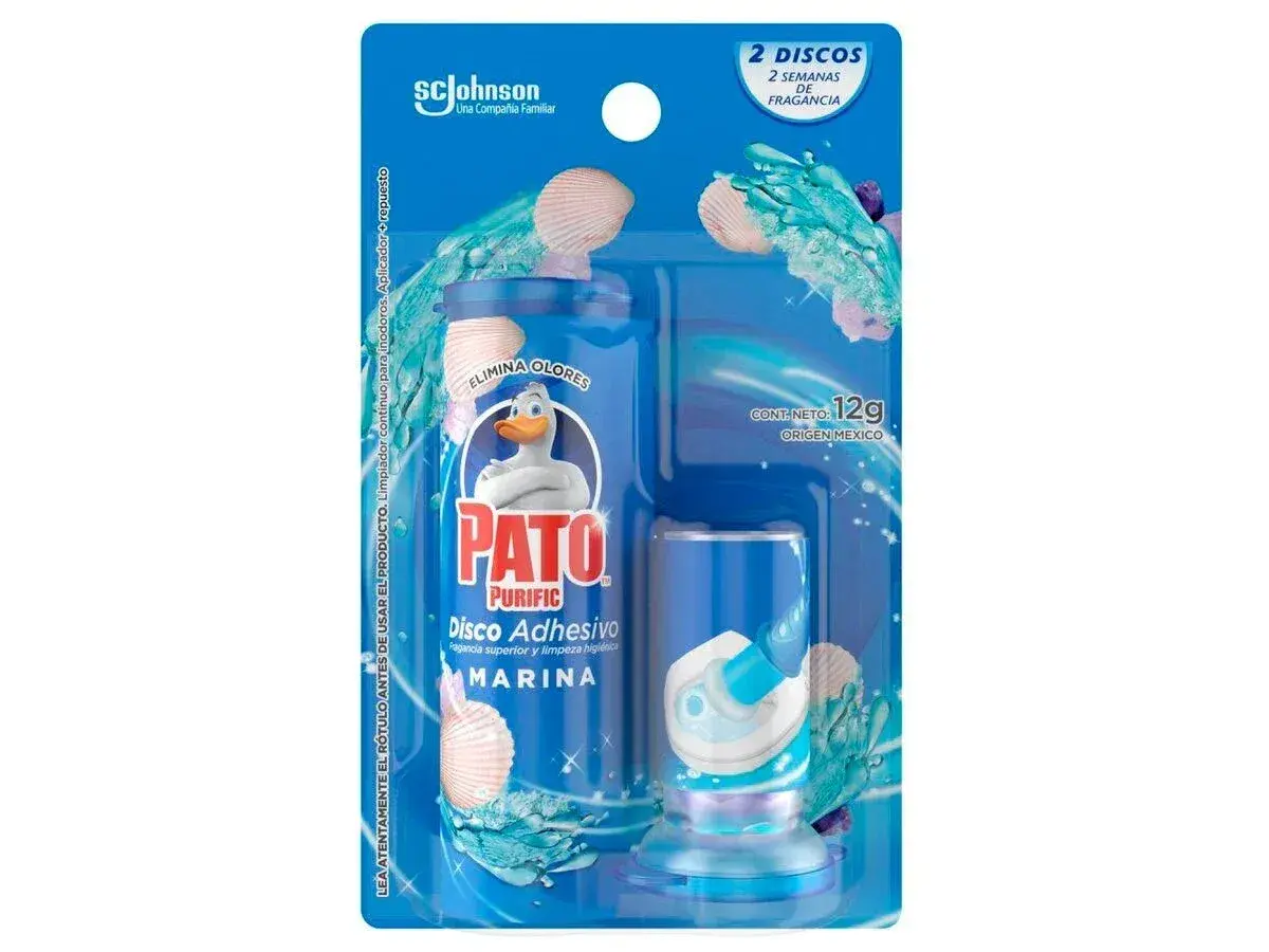 El Gel Adhesivo W.C. Marina de Pato es un producto de limpieza para el baño que asegura una higiene profunda y duradera, junto con su aplicador que facilita su uso. Con sus discos activos de desodorante para inodoro, Pato Purific ofrece una frescura continua y agradable en el baño, manteniendo el ambiente limpio y perfumado.