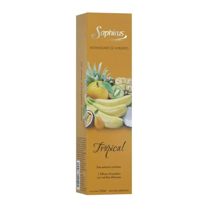 El Difusor Saphirus Tropical ofrece una fragancia frutal fresca y muy difusiva, que llena los ambientes con una mezcla vibrante de frutas tropicales y brisa marina. En el corazón destacan las notas de pera, sandía y jugo de frutas, mientras que el fondo de almizcle, caramelo y vainilla aporta calidez y suavidad. Ideal para el hogar u oficinas, perfuma de manera constante y agradable gracias a sus varillas de rattan.- Fragancia frutal tropical y fresca- Aroma duradero y equilibrado- Presentación con varillas de rattan- Contenido neto: 125 ml- Familia olfativa: Frutales